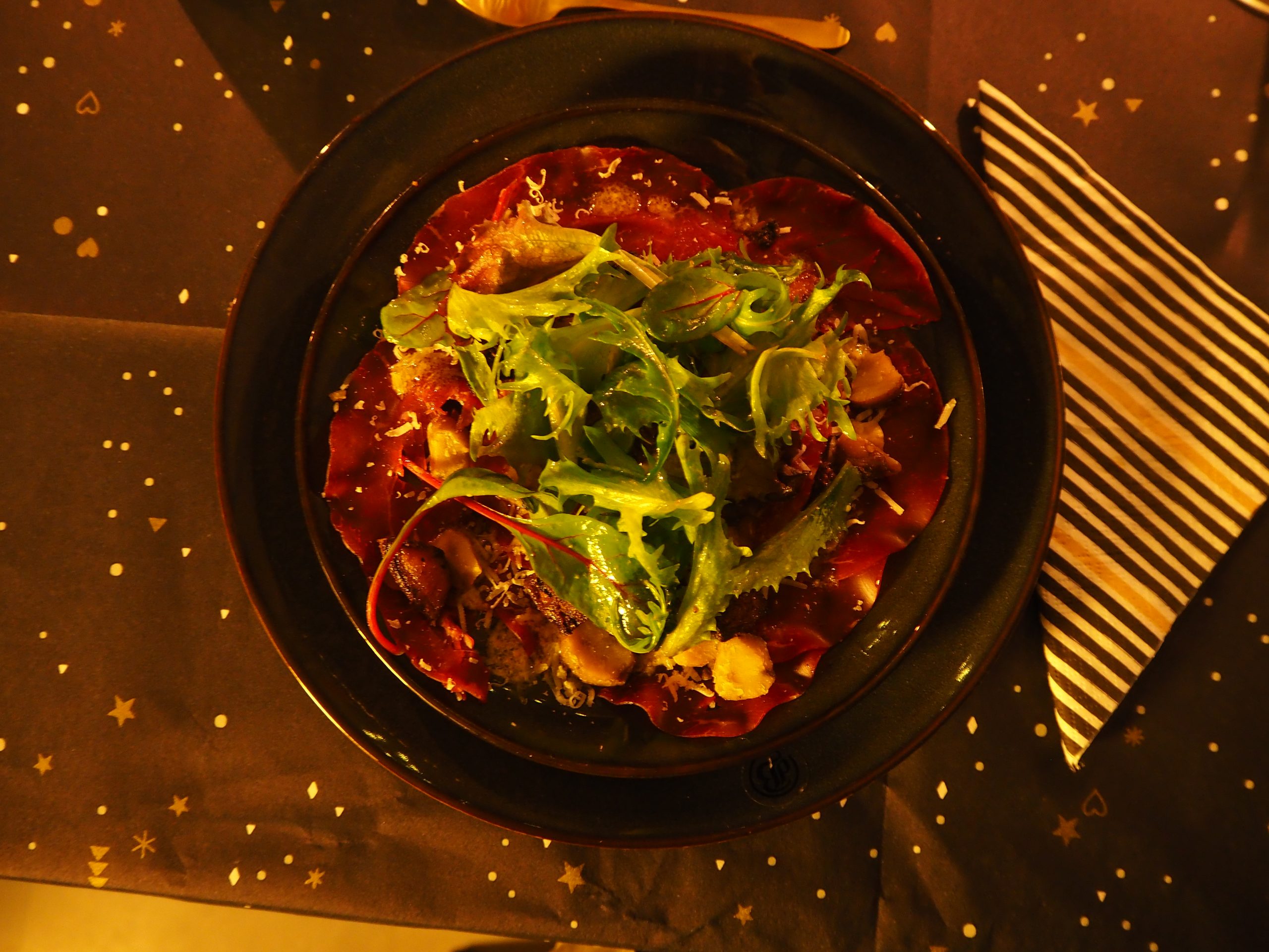 Dit krijg je als de dochter van een vriendin gek is op koken, een negen gangen menu. Dit is iets wat lijkt op Carpacio, maar het niet is. Met Kastanjes, Pompoen, Veldsla, en veel meer. (Gang twee)
