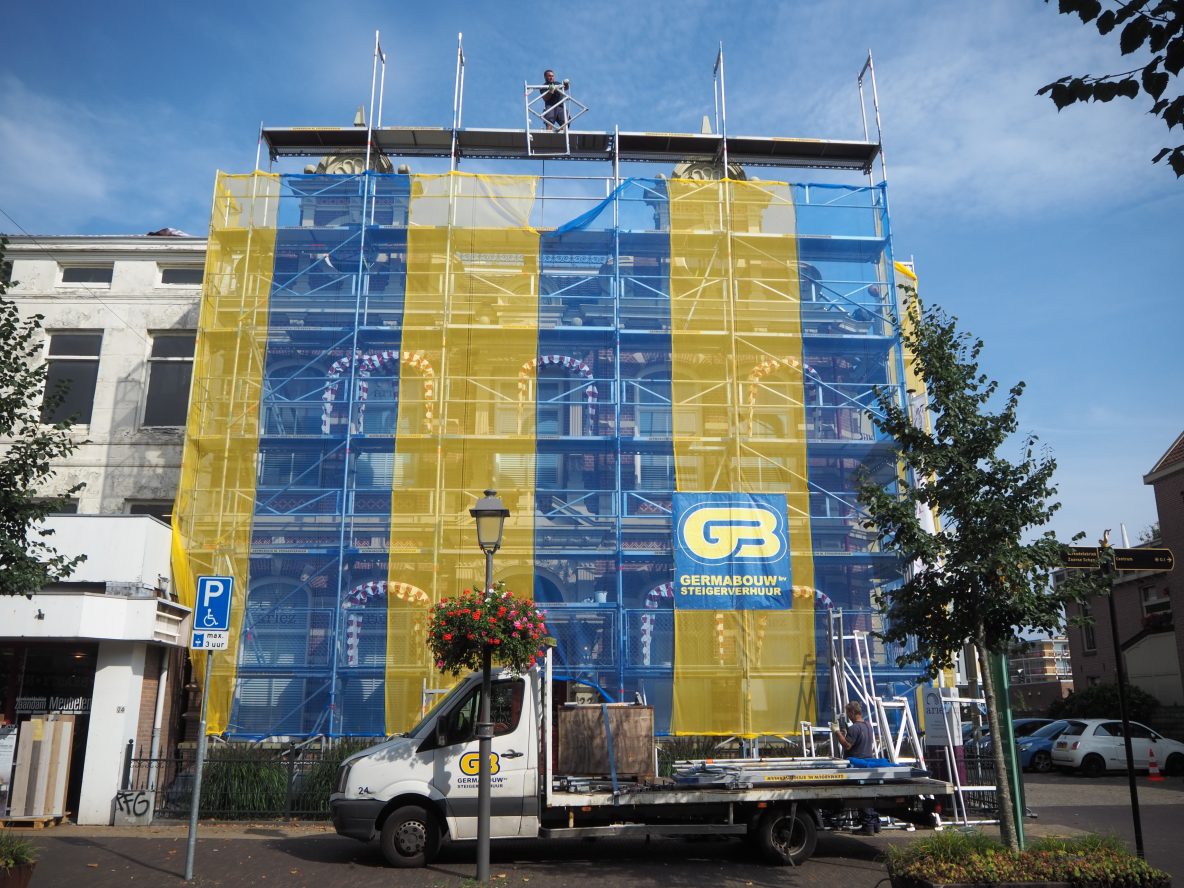 Julianaplein: Zes schilders tegelijk bezig met een “piece”. Morgen ga ik eens kijken hoe het geworden is
