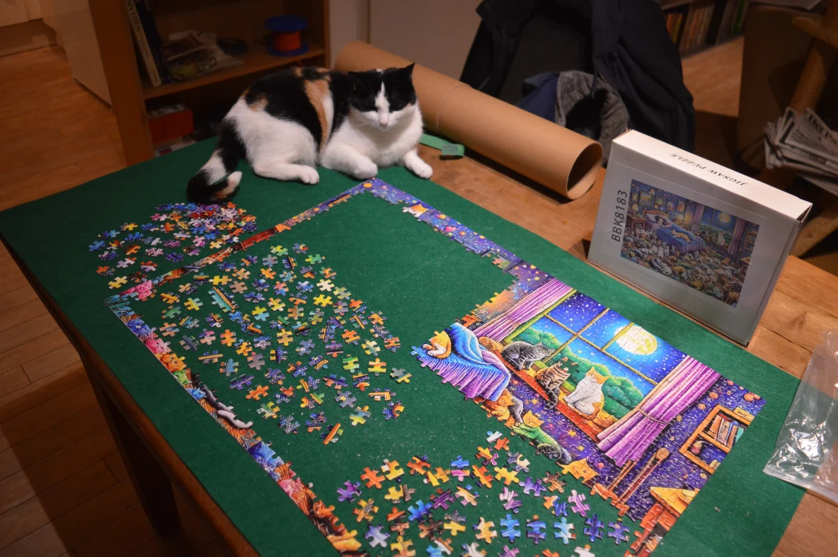 Kedi wil ook graag meedoen met puzzelen, maar eigenlijk wil ze het liefst alle puzzelstukjes van tafel gooien en er dan als een gek achteraan rennen, elk stukje in de lucht gooien, en er op kauwen tot het nergens meer past.