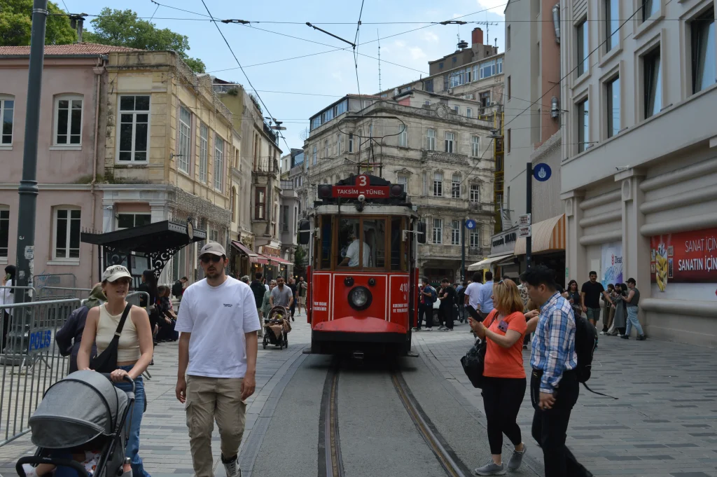 De beroemde tram op Istiklal cadessi, de belangrijkste winkelstraat van Istanbul