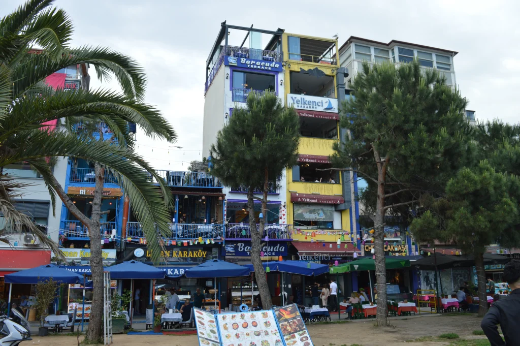 Op elkaar gestapelde etages van visrestaurants