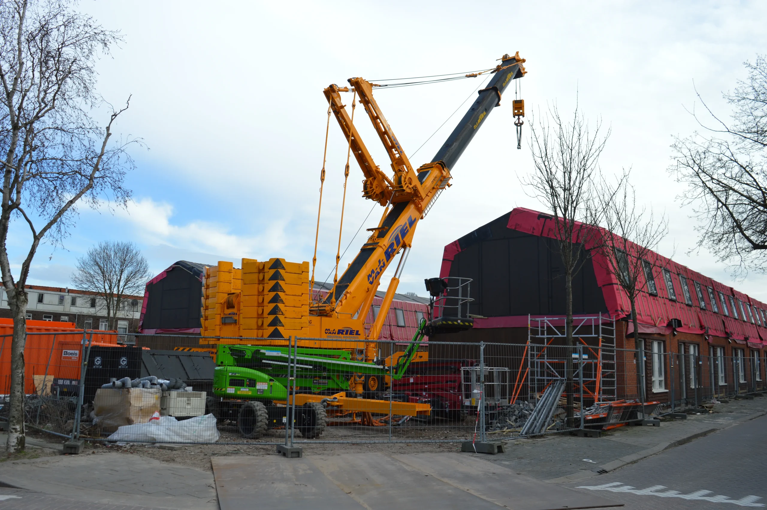 Dr. Schapmanstraat: De hijskraan van M.J. van Riel die nodig was om de huizen in de Rosmolenbuurt op hen plek te zetten
