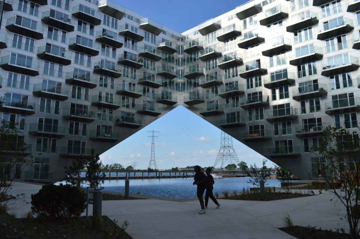 Een bijzonder gebouw op IJburg. Als je op de binnenplaats staat kijk je naar landelijk noord en via de openbare trappen kun je boven op het gebouw komen en een rondje lopen