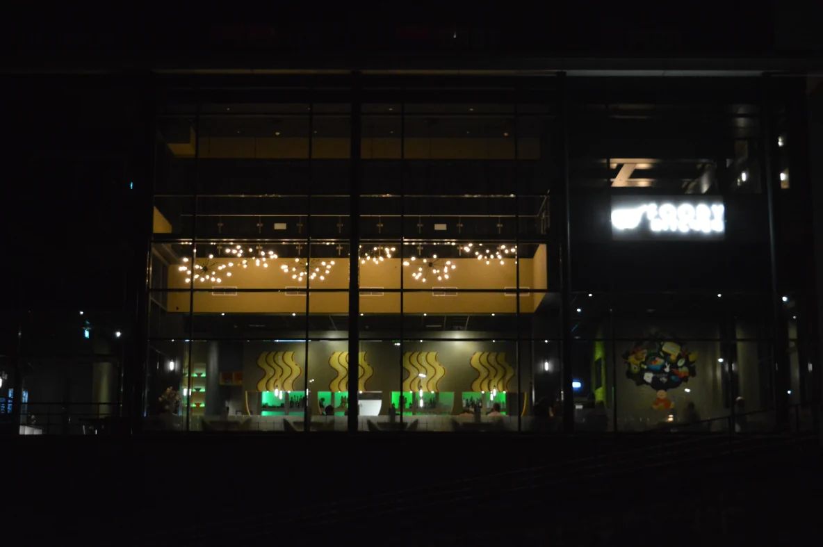 Het gebouw van Fluxus staat in de LED schijnwerpers vanwege de open avond