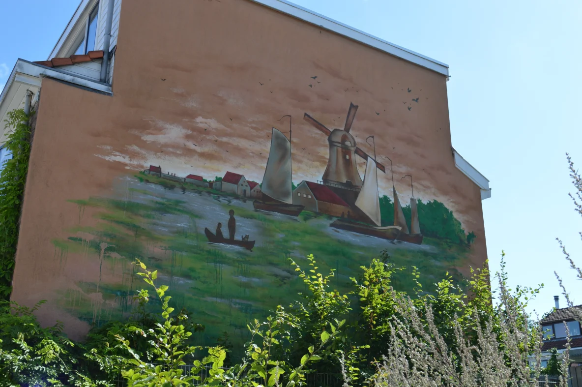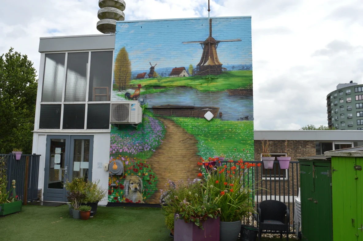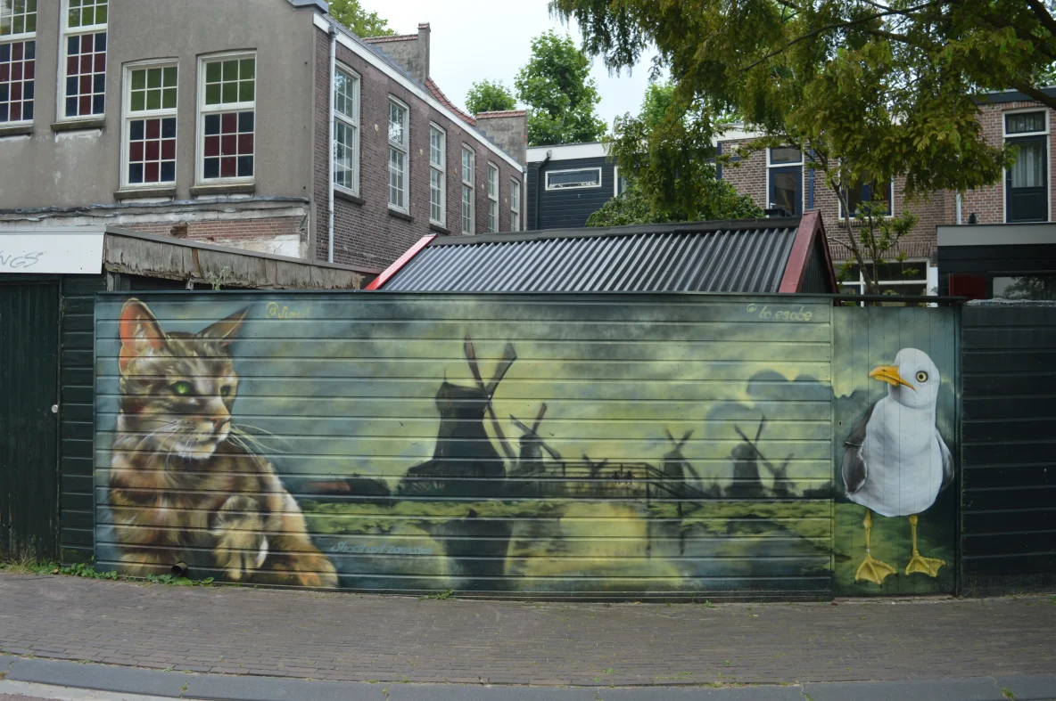 Jonge Arnoldusstraat: Een werk van BC.Esobe en S.Cmart op de Tamarinde school, maar welke vogel (eend) is dit?