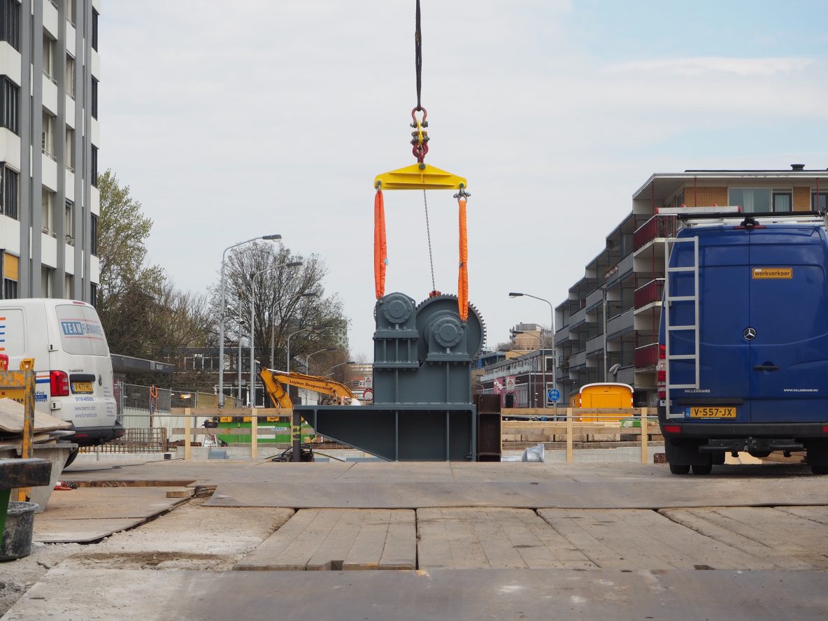 Beatrixbrug: Een onderdeel van de nieuwe Beatrixbrug hangt in de takels