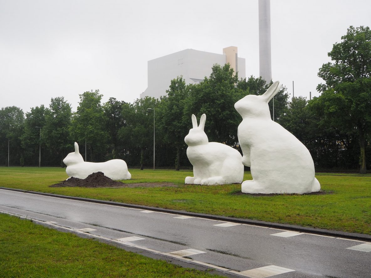 Nieuwe Hemweg: Een groepje konijnen langs het fietspad om de rit van Amsterdam naar Zaandam te veraangenamen