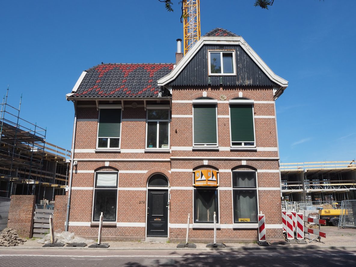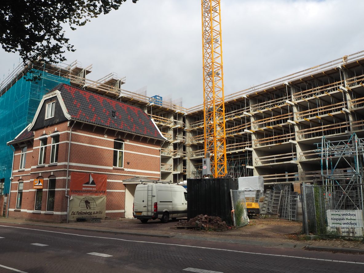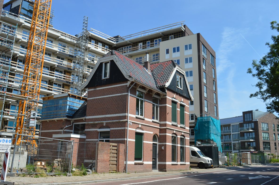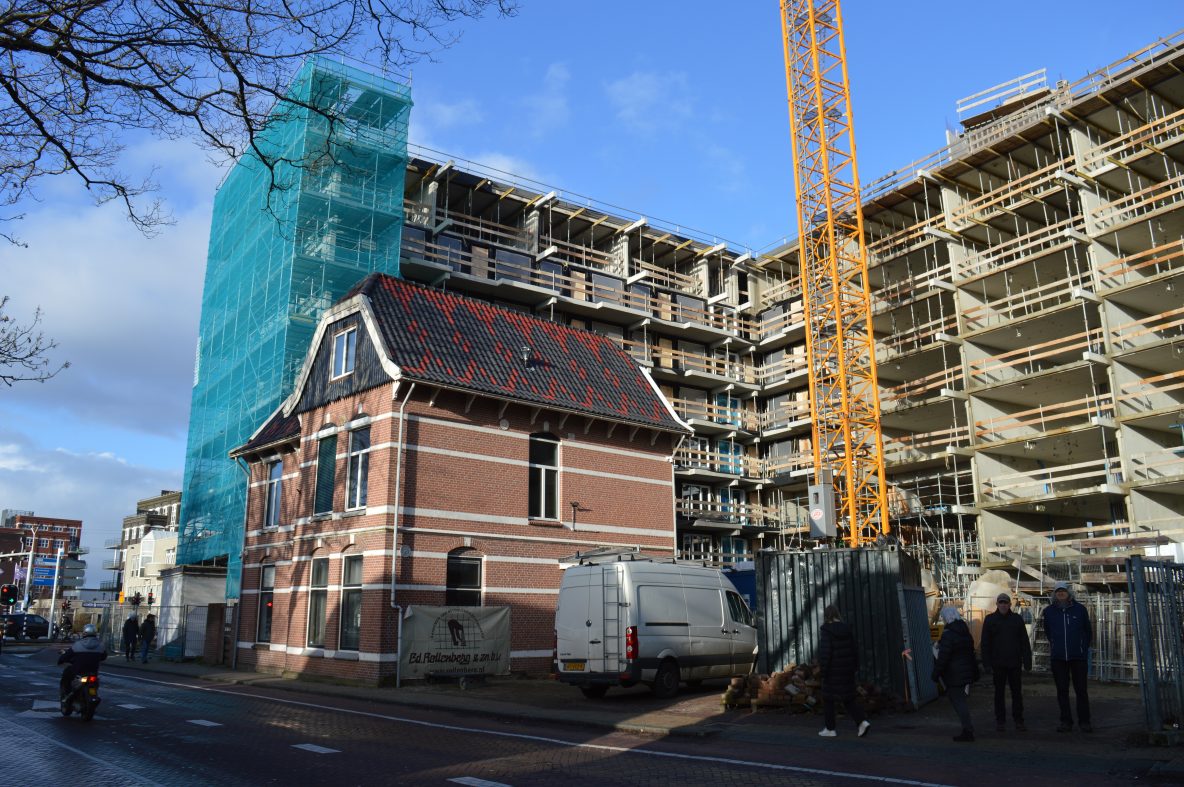 Westzijde: Het kleine huisje valt in het niet bij het grote flatgebouw