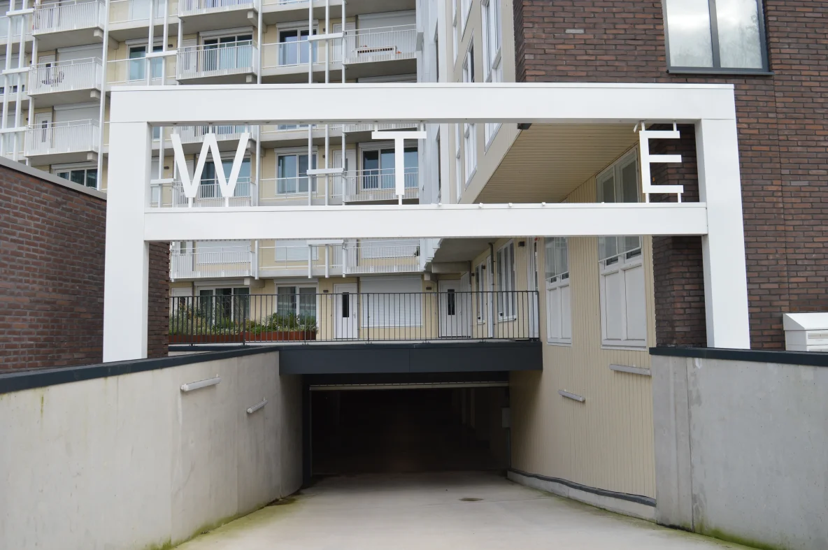 Westzijde: Er zijn wat letters van het bord boven de ingang van de parkeergarage van de Industrieel afgevallen