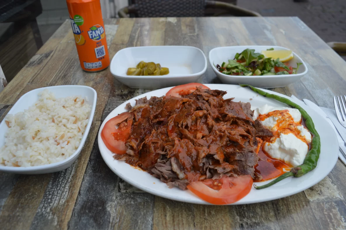 Iskender kebab: Lamsvlees met tomatensaus en daaronder brood, er naast een klodder yoghurt