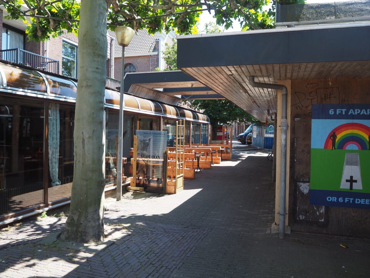 Nicolaasstraat: Nu de kroegen weer open mogen staat de dam vol met tafeltjes en stoeltjes