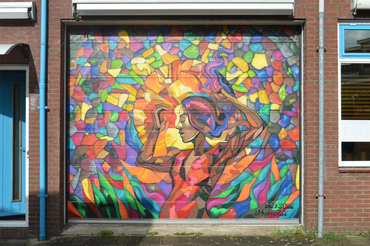 Boomgaardstraat: Een oude schildering van taxi Ratax op een deur van Vonk
