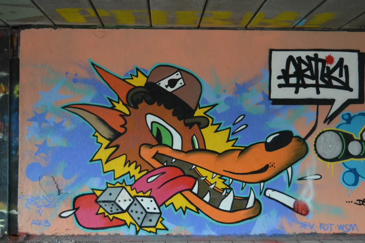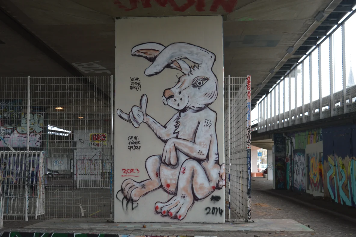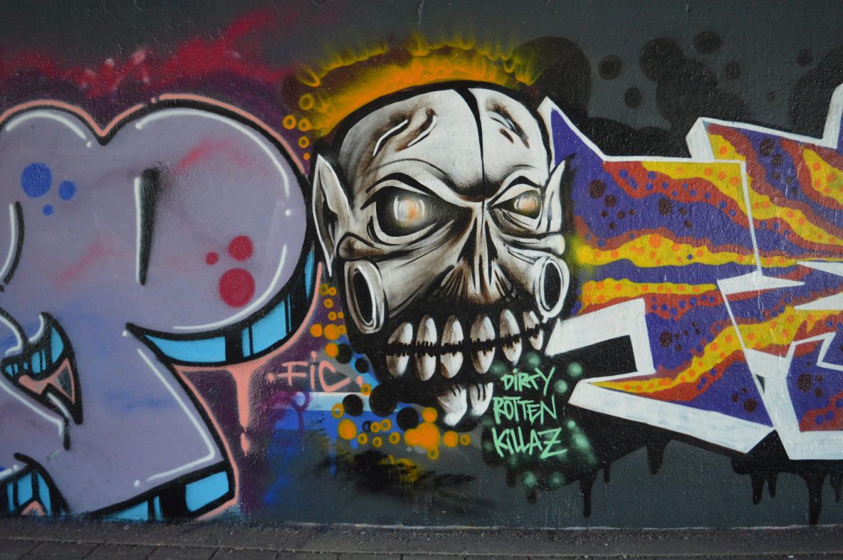 Westzijde: Op de natte straat weerspiegeld de graffiti bijna