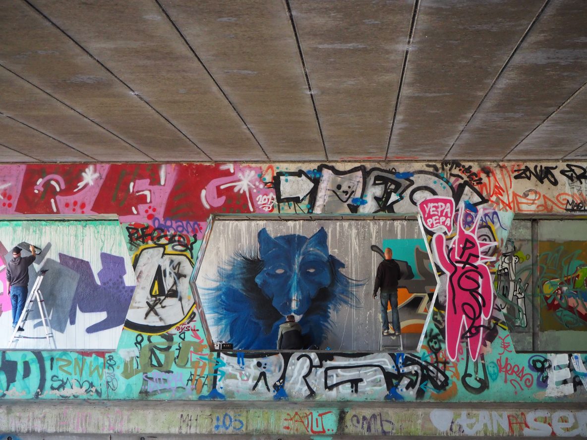 Julianaplein: Zes schilders tegelijk bezig met een “piece”. Morgen ga ik eens kijken hoe het geworden is