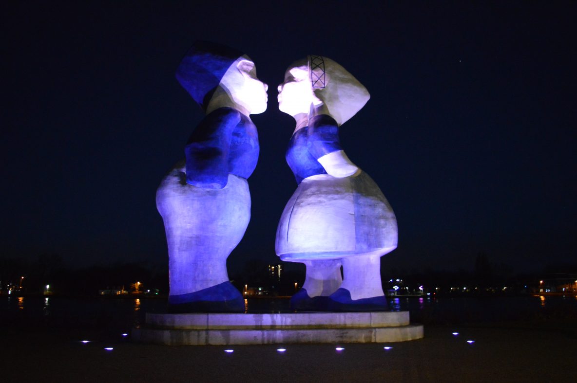 S’avonds is het kussend paartje in verschillende kleuren verlicht