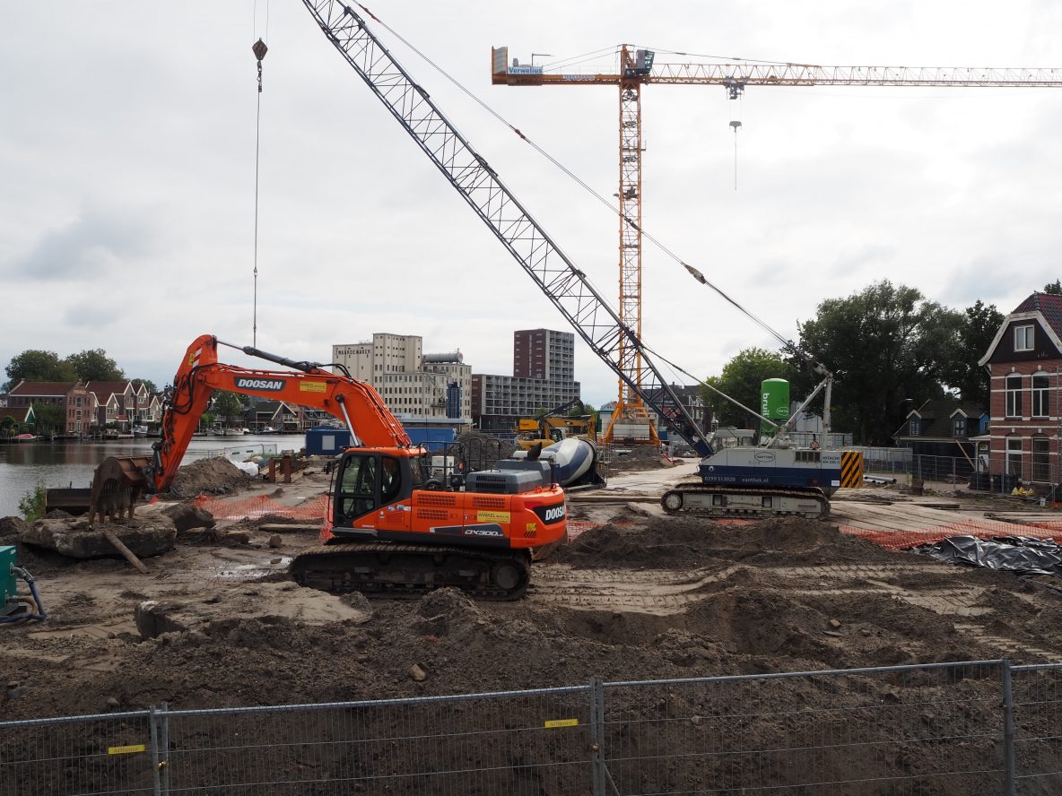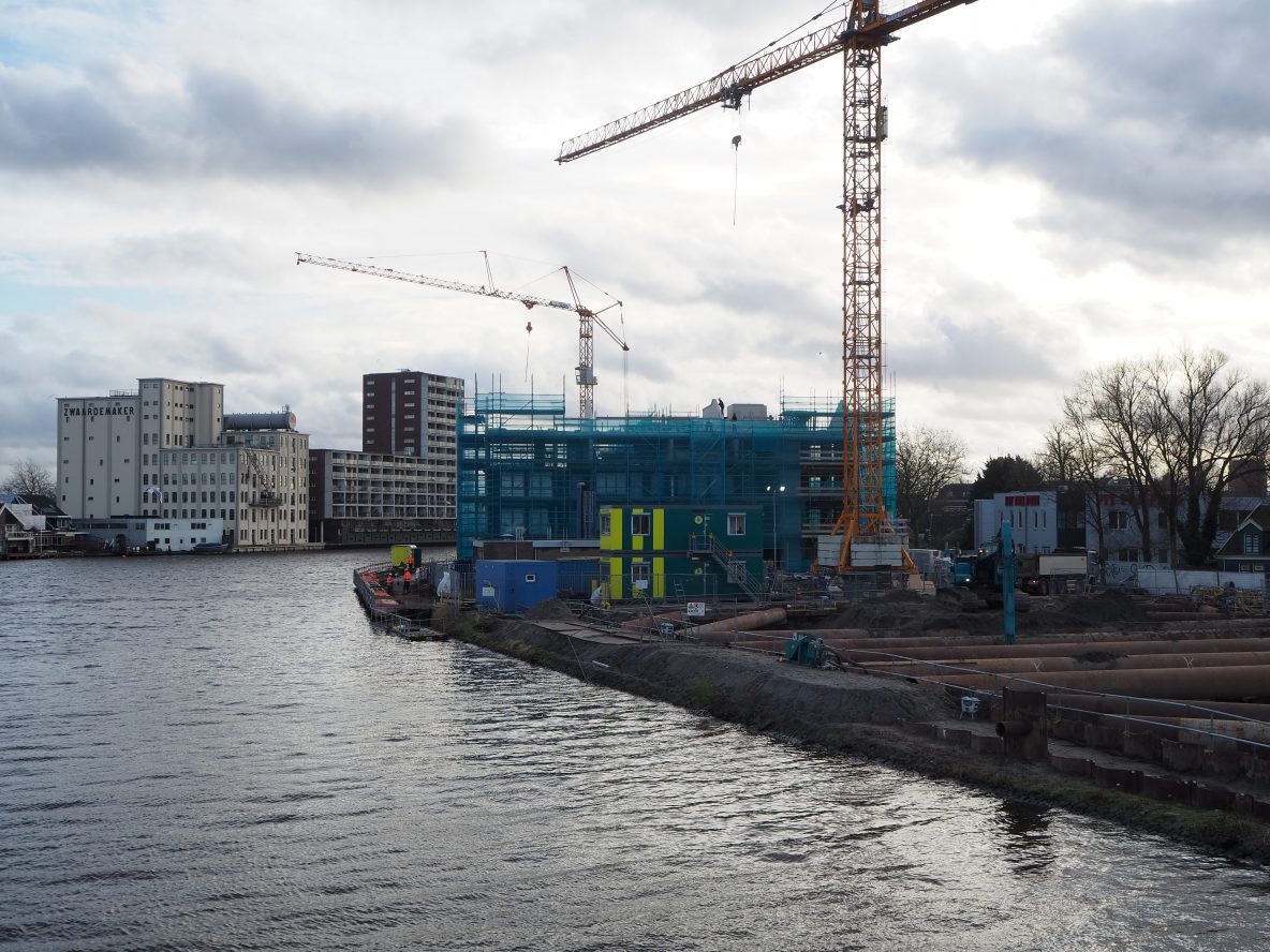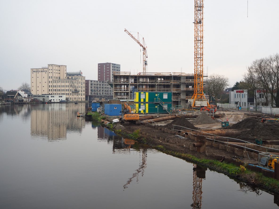 Westzijde: de kraan van het nieuwbouw project de Pauw torent boven de Westzijde uit