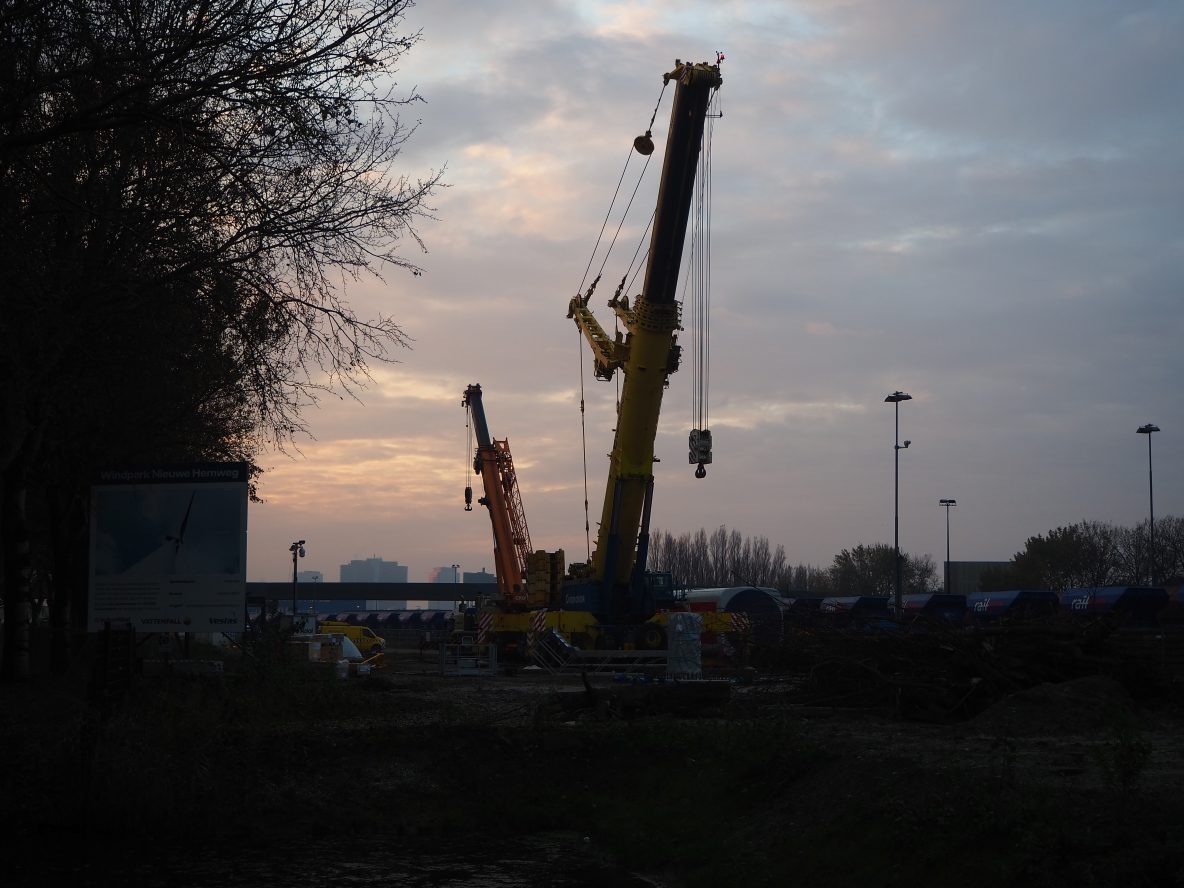 Nieuwe Hemweg: Er is een kraan geplaatst om de eerste windmolen in elkaar te zetten