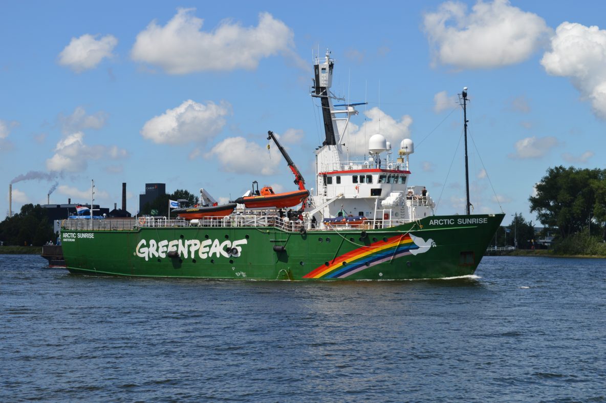 Hempont: De Rainbow warrior op weg naar de sluizen van IJmuiden