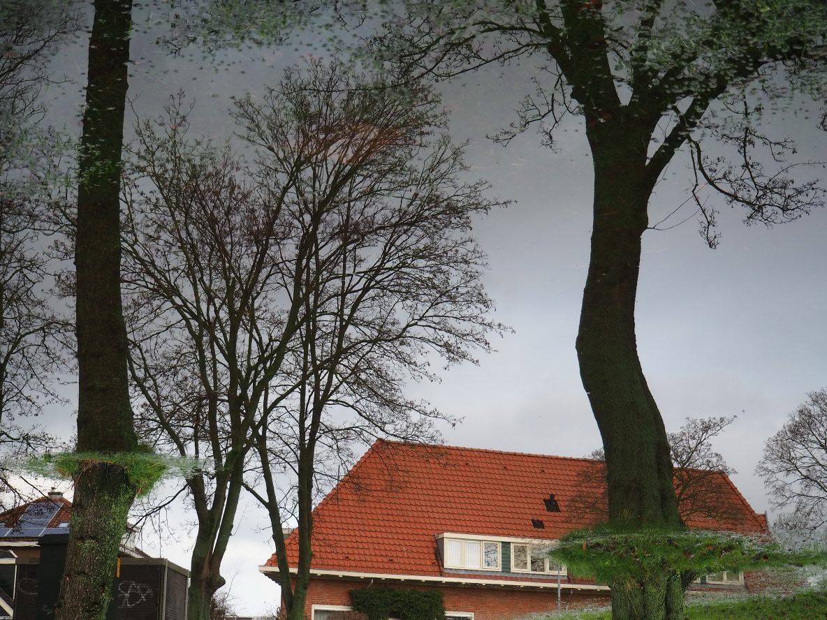 Tuinierstraat: Bomen spiegelend in een plas op het Steve Bikoplein