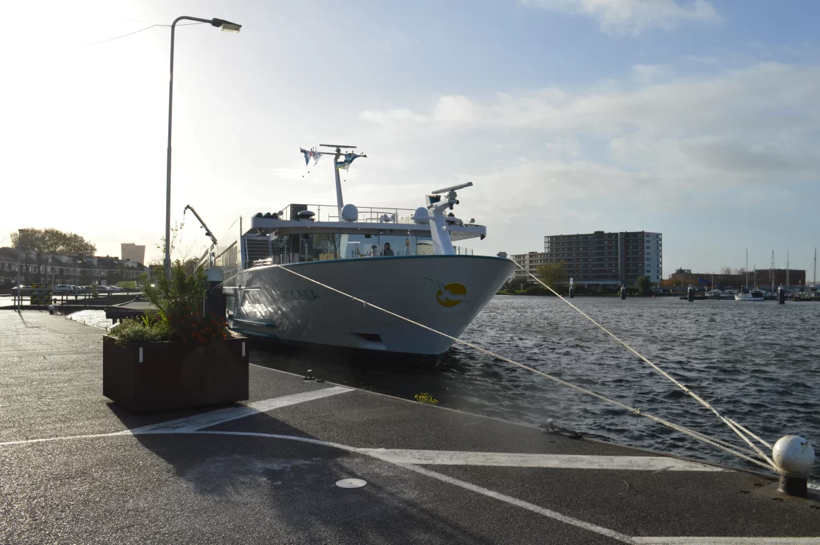 Prins Hendrikkade: Partyschip Amalia rust uit voor het weer terug vaart naar Alkmaar