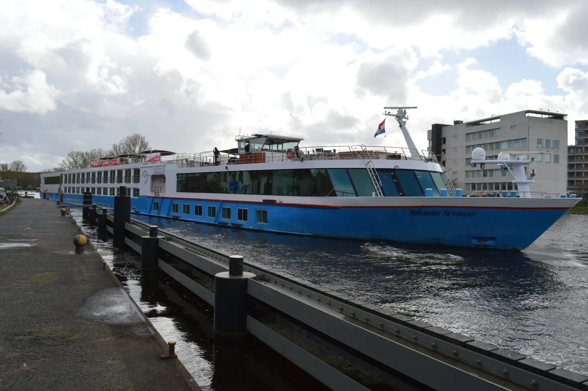 Prins Hendrikkade: De Johann Strauss vaart achteruit om bij de Den Uylbrug te keren