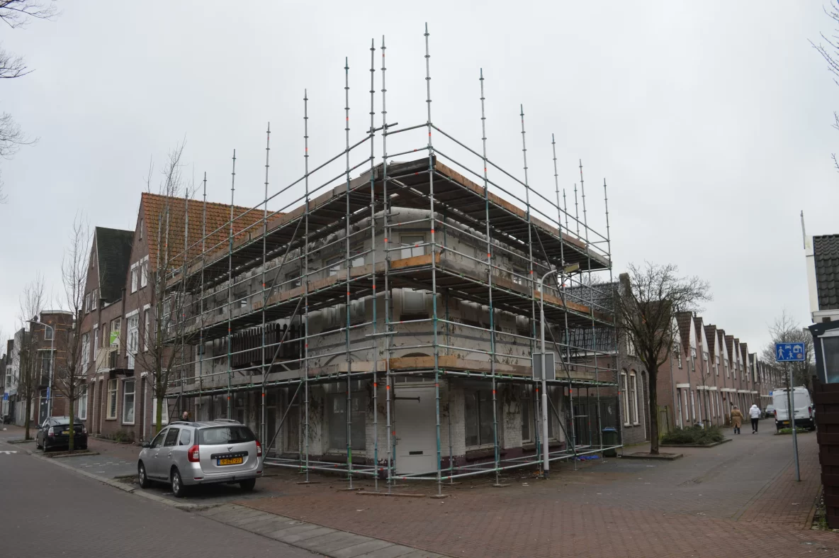 Het gebouw op de hoek Czarinastraat/Menschikoffstraat is ingepakt in plastic