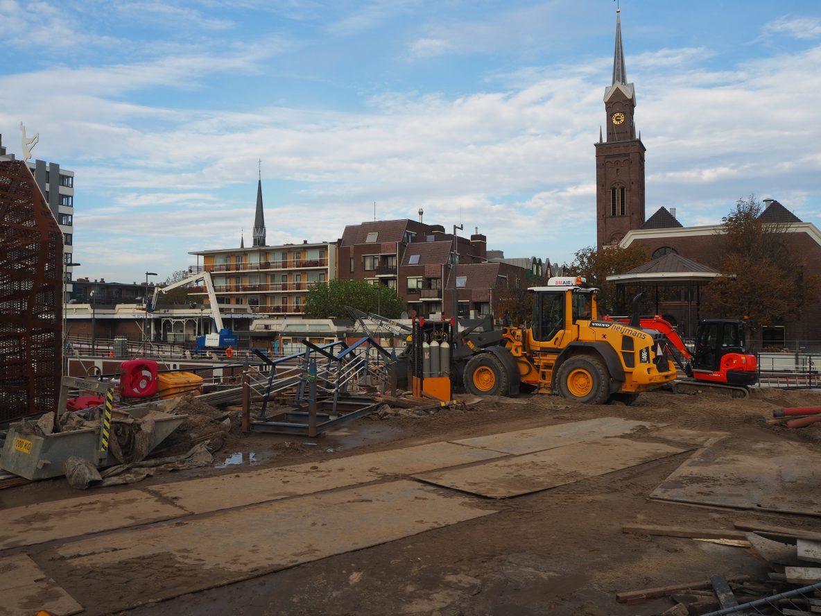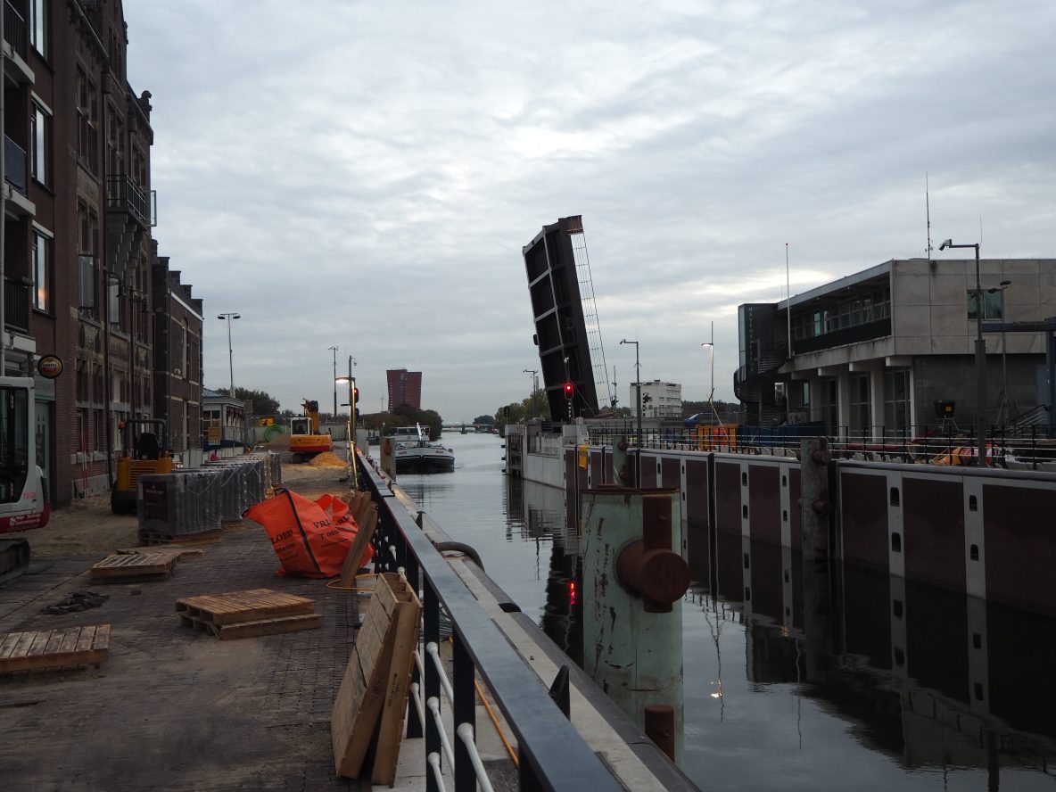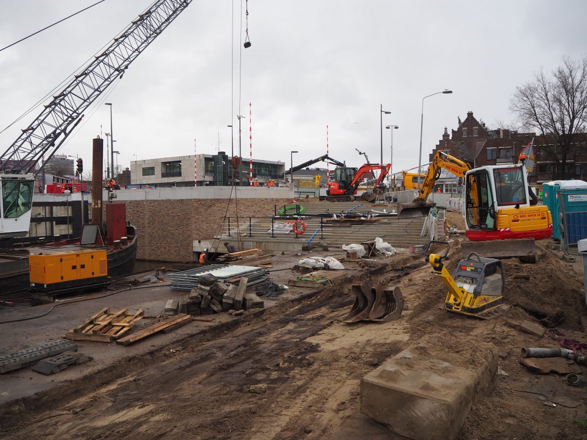 Westzijde: Nu de sluizen bijna klaar zijn worden de stalen constructies waarop de bouwketen stonden weg gehaald