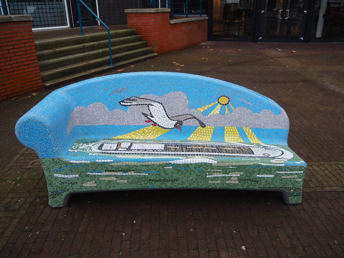 Wilhelminastraat: Om te vieren dat het werk aan de sluis klaar is is er een bankje bij het Zaantheater geplaatst