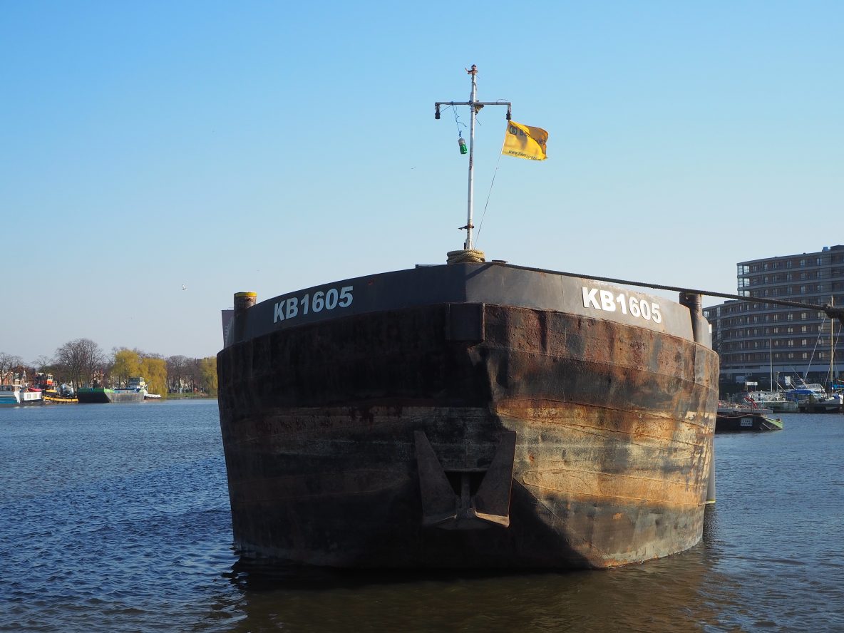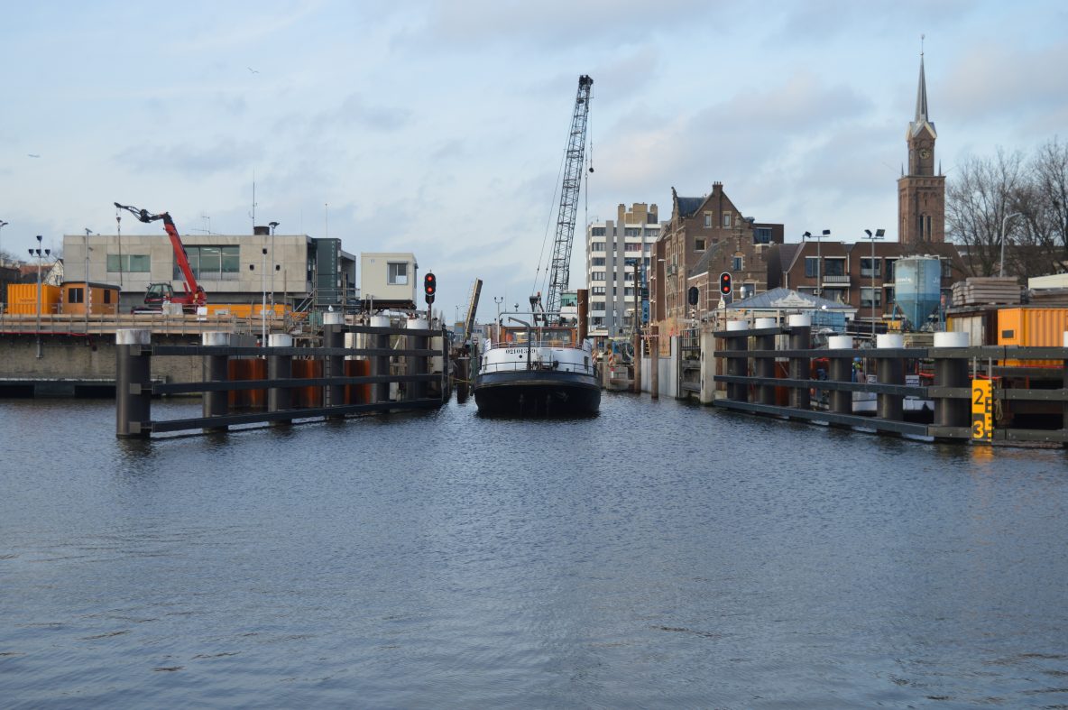 Nietzovlotbrug: Een schip ligt te wachten op het uitbaggeren van de sluis