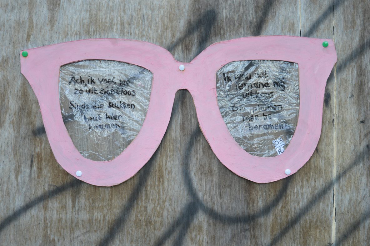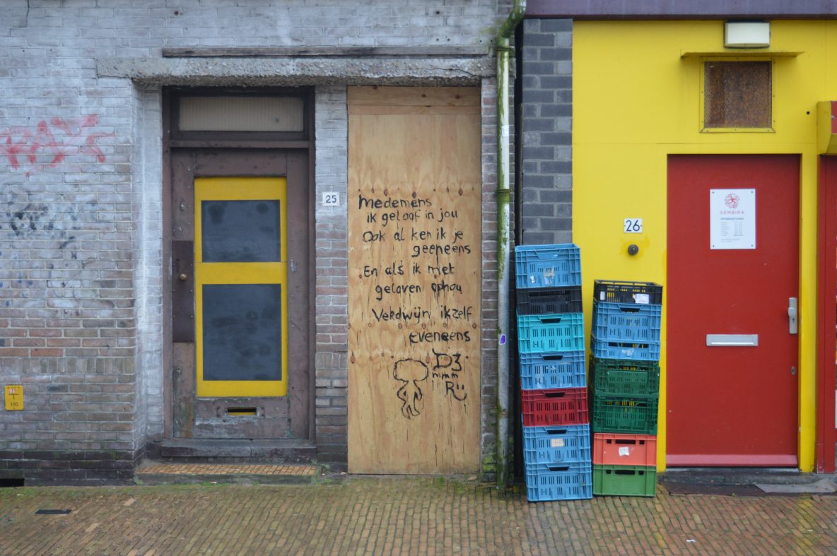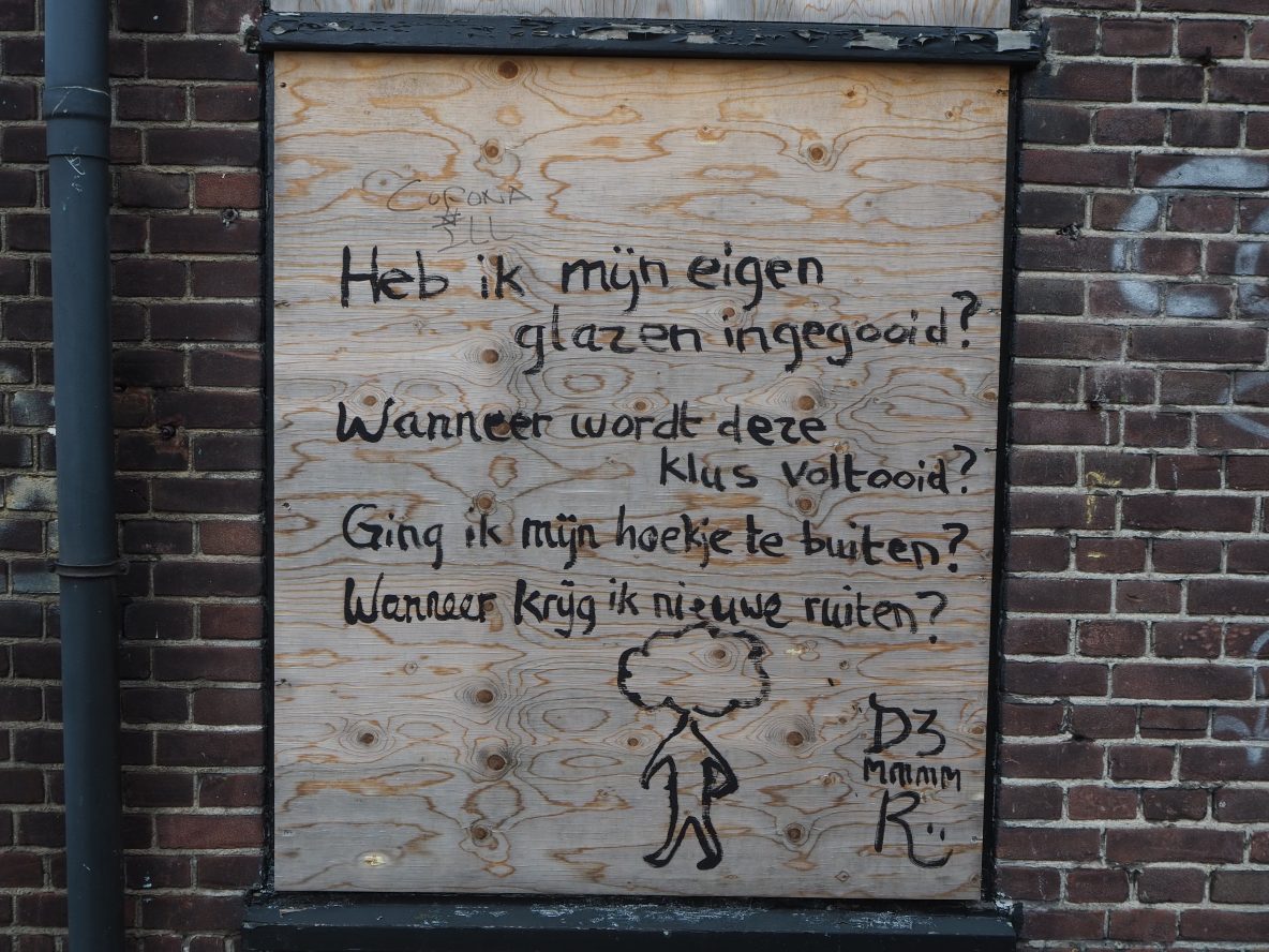 Zwaardemakerstraat: Een slecht te lezen gedicht van de anonieme stadsdichter, er staat Ach, ik voel me zo uitzichtloos sinds die stukken hout hier kwamen.Ik wou dat iemand mij uitkoos om plannen mee te beramen