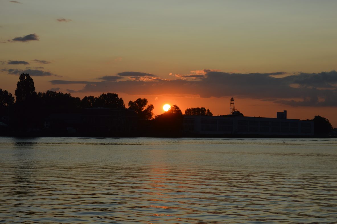 De skyline van Zaandam in de ondergaande zon (Wie weet er een goed Nederlands woord voor skyline?)